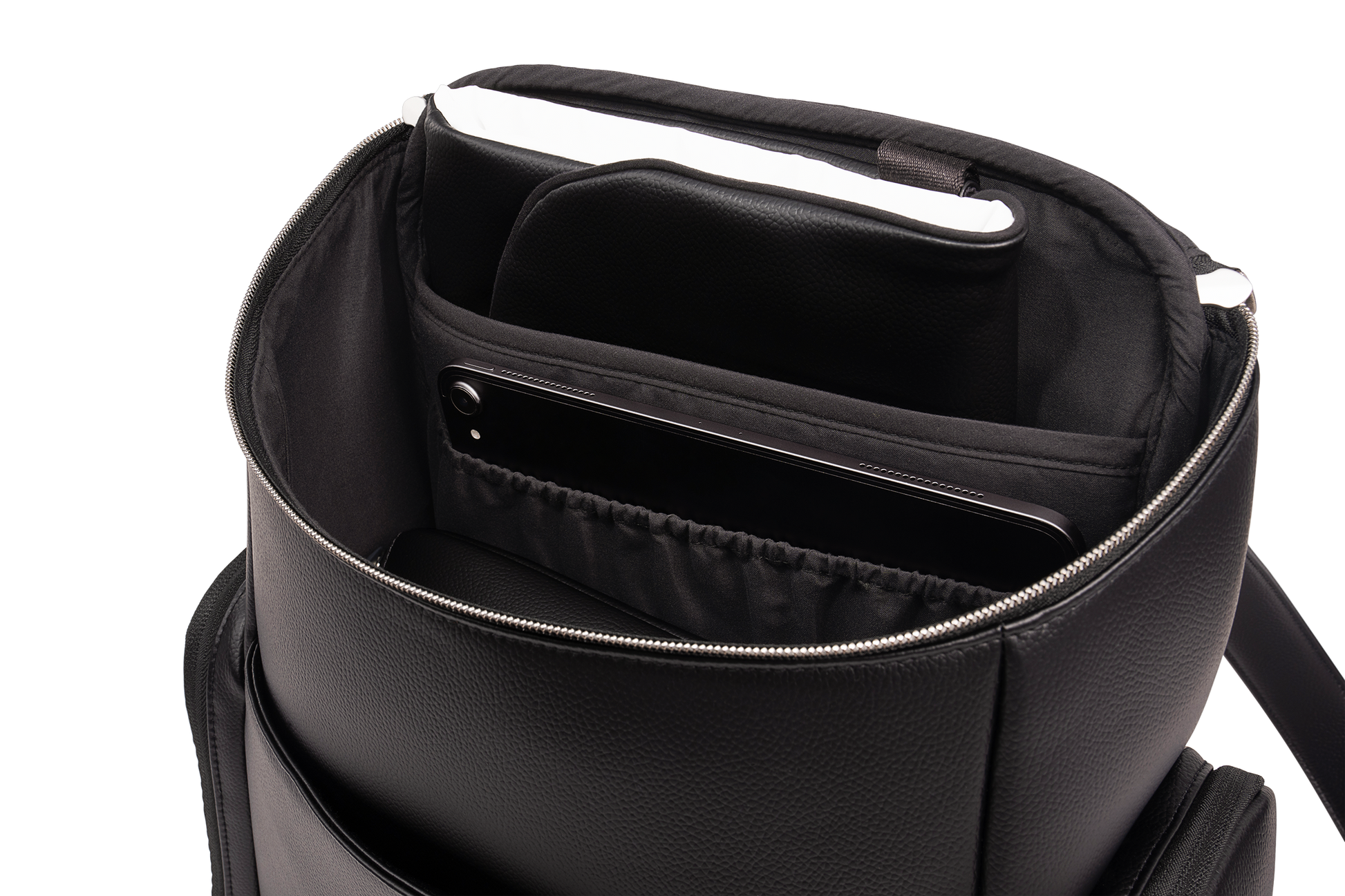 The Essential bag redefines everyday luxury with its chic leatherette styling and versatile parenthood functionality. Crafted as a multi-tasking backpack that also serves as a diaper bag, it features a laptop-friendly design with a thoughtful array of exterior and interior pockets, a handy changing pad clutch, and a luggage trolley sleeve for travel convenience.
